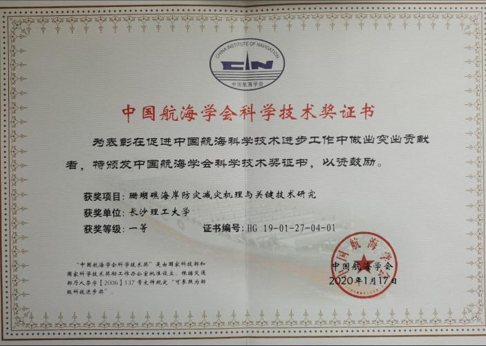 2020年11月17日,中国航海学会在广东省广州市召开的2020年学术年会上举行了2019年科学技术奖颁奖典礼。以太阳成集团tyc122cc入口为第一完成单位,水利工程学院海岸海岸带开发利用与防灾减灾科研创新团队成员姚宇特聘教授为第一完成人的成果“珊瑚礁海岸防灾减灾机理与关键技术研究”荣获中国航海协会科学技术奖一等奖。