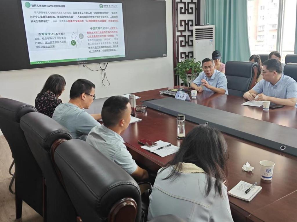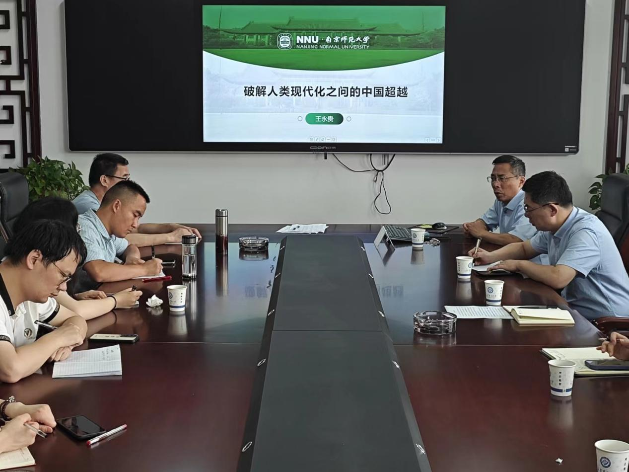 6月20日,国家级高层次人才计划入选者、南京师范大学马克思主义一级学科带头人、博士生导师王永贵教授莅临马克思主义学院,在我校云塘校区文科楼B602会议室为学院师生带来了一场主题为“破解人类现代化之问的中国超越”的精彩讲座。文贵全副院长,谢文成副教授、高小枚副教授、王威峰副教授,管亚苹博士、陈方芳博士、叶再兴博士等学院青年教师和一年级研究生参加了讲座,讲座由张明海院长主持。