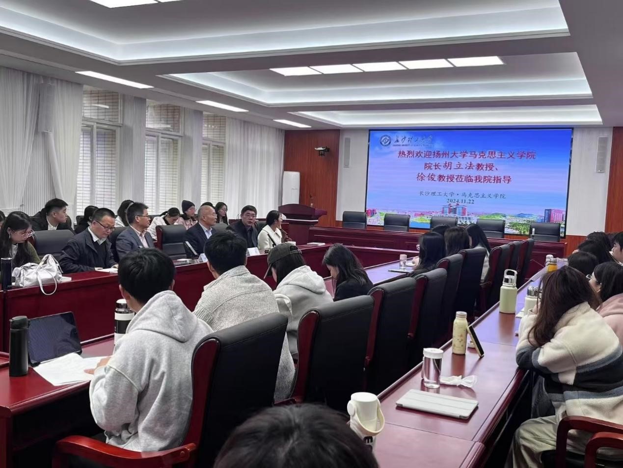 2024年11月22日上午9:00,扬州大学马克思主义学院院长胡立法教授、扬州大学中共党史党建研究院副院长徐俊教授应邀来到我院,围绕马克思主义理论热点与学术论文写作问题,在云塘校区文科楼B501会议室为我院师生带来了一场精彩的学术讲座。本次讲座由马克思主义学院院长张明海主持,我院部分教师及2024级马克思主义理论研究生参加。