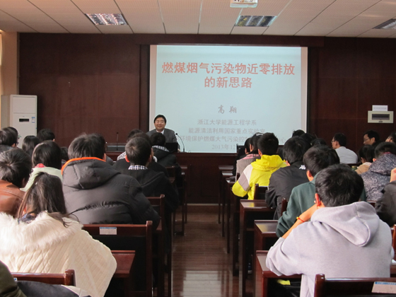2013年12月3日上午,浙江大学高翔教授应邀在能动学院多功能报告厅做了题为“燃煤烟气近零排放的新思路”的学术报告。报告会由院长陈冬林教授主持,湖南省电力勘测设计院副院长、总工程师张力教授、能动学院领导及相关专业教师和学生共100余人参加了报告会。