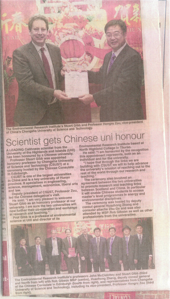 代表团在英国爱丁堡中国领事馆与英国高地与岛屿大学举行合作协议签约仪式,爱丁堡中国领事馆副领事张华忠先生及英国国会议员Rob Gibson先生参加了签约仪式。邹宏如校长和陈冬林院长分别向英国高地岛屿大学环境研究院Stuart Gibb教授与John McClatchey教授介绍了学校与能源与动力工程学院的基本情况,同时Stuart Gibb教授向代表团介绍了英国高地与岛屿大学环境研究院所从事的研究工作。此外,在爱丁堡中国领事馆副领事张华忠及苏格兰国会议员Rob Gibson的见证下,太阳成集团tyc122cc入口代表团与英国高地与岛屿大学代表团举行了客座教授聘任仪式,邹如宏副校长向英国高地与岛屿大学Stuart Gibb教授颁发了客座教授证书,签署了太阳成集团tyc122cc入口与英国高地与岛屿大学合作备忘录。仪式结束后,代表团与英国高地与岛屿大学就研究生联合培养、科研合作与互派访问学者等进行了深入而广泛的交流,并对研究生联合培养协议进行了充分地沟通与探讨,双方希望尽快启动研究生联合培养。太阳成集团tyc122cc入口和英国高地与岛屿大学的交流与合作洽谈事宜很快被当地主流媒体进行了报道。