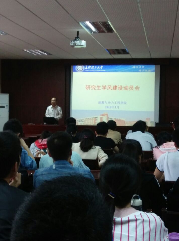 为加强学院研究生学风建设,提高研究生培养质量,2016年5月25日下午3点,能动学院在工科一号楼A428召开研究生学风建设动员大会,会议由主管研究生工作的副院长刘忠主持,学院2014级、2015级全体研究生参加了会议。