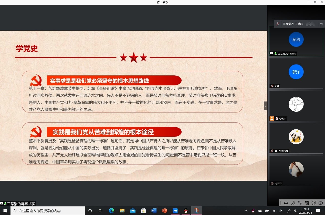 2021年2月26日下午一点半,能动学院本科生第一党支部顺利开展《学党史?述初心?担使命》PPT分享活动。本次活动的形式为线上分享,参加活动的是能动学院本科生第一党支部所有党员同志,共43名。