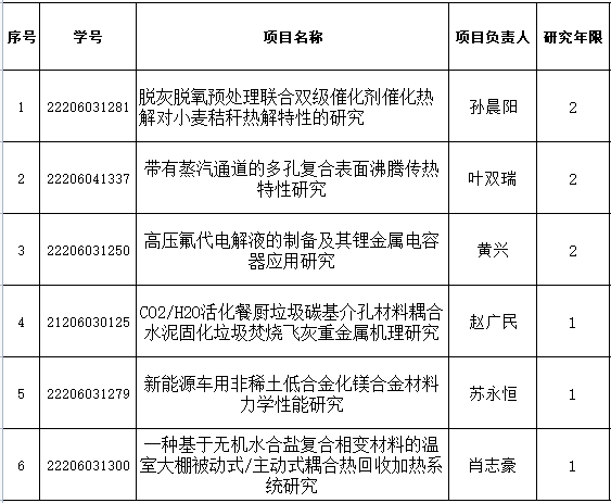 根据《太阳成集团tyc122cc入口专业学位研究生“实践创新与创业能力提升计划”实施细则》(长理工大研[2020]24号)文件精神,经个人申报,学院组织专家评审,拟推荐“脱灰脱氧预处理联合双级催化剂催化热解对小麦秸秆热解特性的研究”等6项“实践创新与创业能力提升计划”项目参加学校评审。具体名单如下: