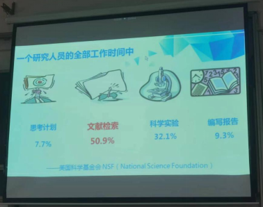 张雪梅教授首先向同学们讲述了一个研究人员工作时间中文献检索时间占比50.9%,可见文献检索是研究生必须具备的能力。随后张雪梅教授详细讲解了相关数据库和搜索引擎的使用技巧DOI号搜索、布尔逻辑检索等实用技巧同时,她还介绍了许多搜索引擎,如中国SCI-HUB知网、谷粉学术、谷歌学术、百度学术、纬度学术张雪梅教授不仅传授给同学们文献检索技巧,还为同学们以后可能遇到的问题如参考文献为什么重要性不足提供解决思路。最后,张雪梅教授给同学们介绍了学校图书馆文献传递、超星发现等强大功能。