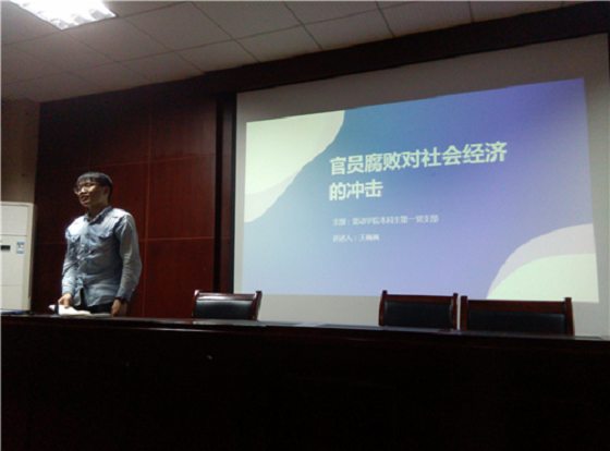 首先由申修伟发言,他介绍了该剧相关情况,《人民的名义》是一部反腐大剧,极具正能量,值得广大党员观看学习。接下来,王巍巍同志向大家讲解官员腐败对社会经济的冲击,他将剧中的小官巨贪的赵德汉与现实中大老虎原铁道部运输局营运部货运营销计划处处长苏顺虎相结合介绍,表示腐败必将得到法律制裁和人民的唾弃。其后用论证法讲解了腐败将不利于资源配置,影响企业投资,加剧了社会贫富差距,让大家深刻了解了腐败的恶劣影响。随后,李添舒给大家讲的是如何从《人民的名义》中学习做一名优秀的共产党员,首先大家观看了一位老革命党员的入党回忆,那个仅仅只有一天党龄的党员为了胜利宁愿牺牲自己的举动让大家久久不能忘怀,李添舒表示大家在和平年代更要反思自己为什么入党,端正入党动机是第一步,又从剧中当官为民的李达康讲解共产党员要将为人民服务落实到实际行动当中,从埋头苦干的易学习同志学习到做好自己的事不抱怨不埋怨,优秀是实打实做出来的。
