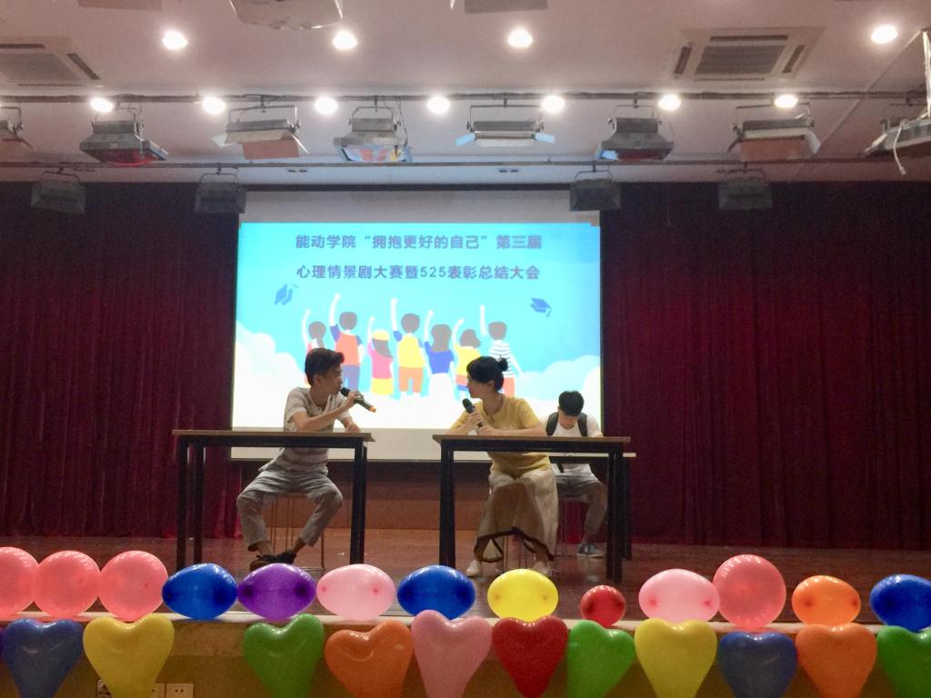 6月3日晚,能动学院组织第三届心理情景剧大赛“拥抱更好的自己”暨525总结表彰大会在文法学院模拟法庭顺利举行。学工办辅导员老师汪华丽、彭博、罗亦欧、代佳欣和200余名学生到场观看。