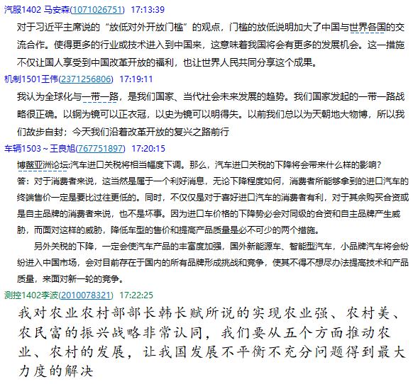 从学习中,学员们了解到本届博鳌亚洲论坛年会以“开放创新的亚洲,繁荣发展的世界我”为主题。历时4天,2000多名嘉宾畅所欲言,提出许多真知灼见,为亚洲和世界提供了“博鳌方案”,贡献了“博鳌力量”。国家主席习近平在博鳌亚洲论坛2018年年会开幕式上发表的主旨演讲,向世界宣示中国在新时代深化改革、扩大开放的坚定决心与重大举措,从博鳌发出构建人类命运共同体的时代强音,赢得各方广泛赞誉。各小组预备党员同志对国家民族的强大和作为大国展现出的包容开放的大国风范均深有感触,通过提问答问的形式大家开展了热烈的讨论。综合大家的讨论内容,国家主席习近平在开幕式演讲中提出的关于扩大改革的四个重大举措成为讨论的焦点,即:大幅放宽市场准入、创造有吸引力的投资环境、加强知识产权的保护和主动扩大进口。