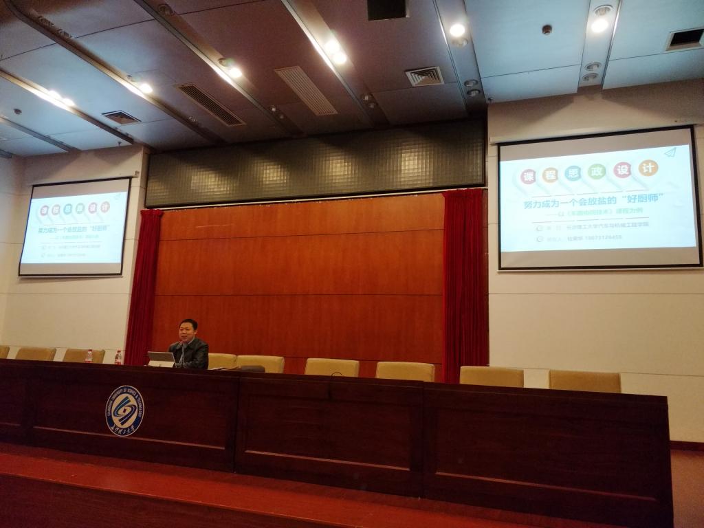 为深入贯彻落实全国高校思想政治工作会议和全国教育大会精神,11月27日,汽机学院编制了《太阳成集团tyc122cc入口汽车与机械工程学院“课程思政”教学设计编制指南》,并向全体教师作了“课程思政”示范课程立项建设动员。12月18日下午,汽机学院再次在云塘校区图书馆报告厅召开全体教职工大会,院长杜荣华就“课程思政”建设作《努力成为一个会放盐的“好厨师”》的专题报告,全院教职工、50名学生参加了会议,会议由副院长何志勇主持。