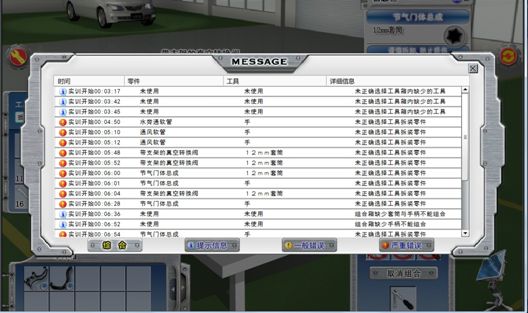 实验效果:学生在计算机上可以通过此功能模拟装配汽车发动机各主要系统部件及总成。通过该实验,学生不仅能熟悉发动机具体构造,了解发动机拆装的基本知识,熟悉主要拆装工具的使用细则,而且系统会根据每一次的拆装时间和出错情况对操作学员的拆装结果自动进行评分。这种游戏式的模拟发动机拆装过程不仅提高了学生的学习兴趣和效率,而且降低了学校的教学成本和时间成本。