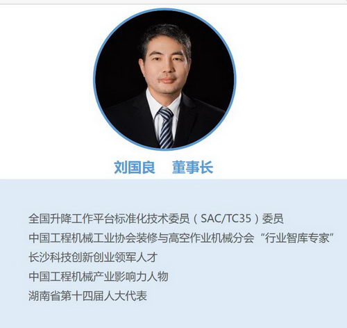 刘国良,全球工程机械TOP50强,全球高机TOP10强制造商--湖南星邦智能装备股份有限公司董事长,总工程师;全国升降工作平台标准化技术委员(SAC/TC35)委员;中国工程机械工业协会装修与高空作业机械分会“行业智库专家”; 长沙科技创新创业领军人才;中国工程机械产业影响力人物;湖南省第十四届人大代表。