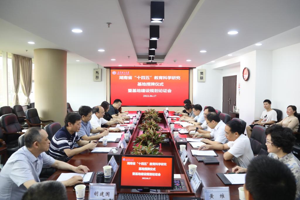 6月17日,湖南省“十四五”教育科学研究基地授牌仪式暨基地建设规划论证会在我校举行。湖南省教育科学研究院院长石灯明、省教科院教育科学规划所所长黄龙威、校党委副书记刘建民、副校长刘朝晖、经管学院党委书记丁丹、经管学院副院长阳立高等出席。社科处处长刘建江主持会议。