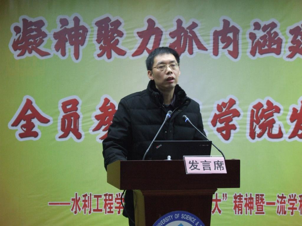 副院长程永舟教授做“强自信,补短板,鼓干劲,造学科高峰——水利工程学院学科和科研情况分析”报告,介绍了第四轮学科评估情况,对学院的科研情况进行了详细的剖析,并对学科发展提出了具体的建议。副院长蒋中明教授做“建设多层次科研团队,推动科技工作持续发展——关于水利工程学院科研团队建设思考”报告,阐述了科研团队建设的必要性,深刻剖析了学院科研团队 的现状,指出了学院“科研团队”运行存在的问题,并给出了科研团队建设的建议。教授代表张贵金做“人人贡献力量,铺就水利工程学科建设新台阶”报告,从教授角度出发,阐述了大力推进水利工程学科建设的必要条件,分析了水利工程学科发展现状,对今后的学科建设工程提出了建议。青年教师代表姚宇博士做“促进青年教师成长,把握学院发展未来”报告,详细分析了学院青年教师的基本情况,剖析了制约青年教师科研发展的因素,汇总提出了学院青年教师们对学科专业发展的建议。