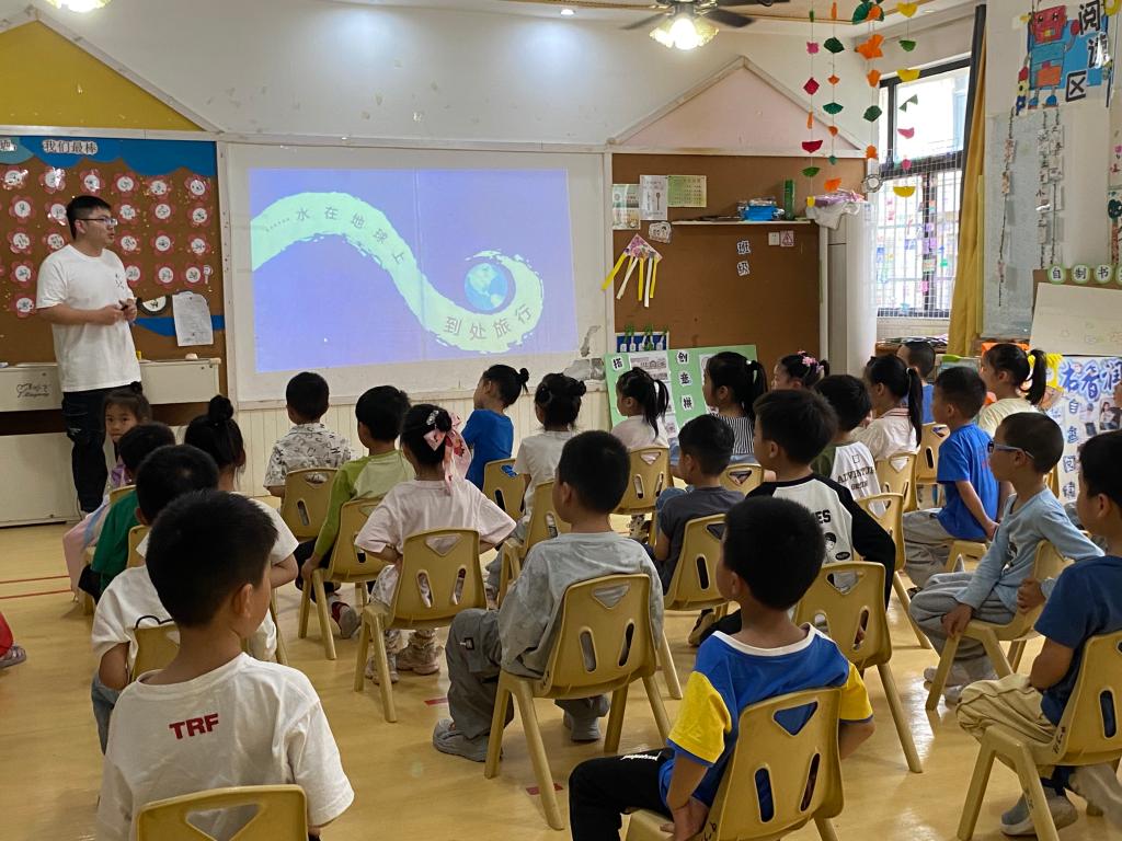 活动伊始,邹欣辰同志以绘本《水的奇妙旅程》为引,用生动的语言和多彩的插图向孩子们讲述水的循环故事。小朋友们围坐聆听,通过“云朵旅行”“雨滴冒险”等情节,直观理解水从蒸发到降落的自然过程,现场互动氛围热烈。?随后,王阳鸿泰同志化身“科学老师”,通过趣味问答和模型演示,向孩子们科普水的分子结构、液态特性及在生活中的重要作用。他借助生活案例,如“水为什么能灭火”“植物如何喝水”,引导孩子们思考水的不可替代性,并呼吁珍惜每一滴水。?