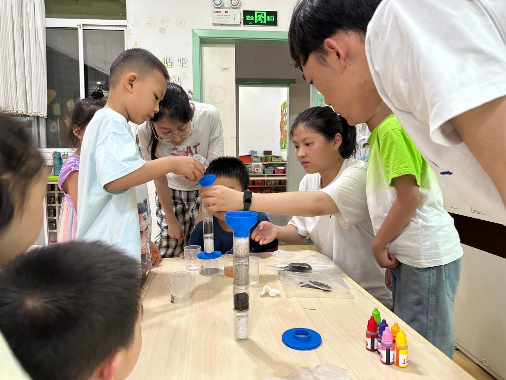 在实践环节,成员徐杨带领孩子们完成两项趣味实验。孩子们先用洗洁精水调配溶液,吹出大小各异的泡泡,在五彩斑斓的泡泡飞舞中观察水的表面张力现象,欢呼声此起彼伏;随后,他们又化身“净水小卫士”,通过简易过滤装置将混浊污水逐步净化,亲眼见证杂质分离的奇妙过程,深刻体会到水的纯净来之不易。