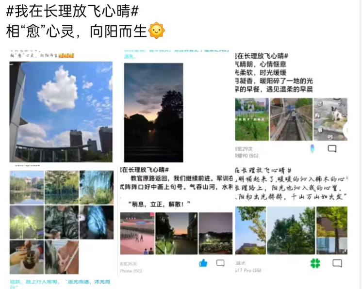 活动具体形式为同学们在QQ空间或朋友圈发布#我在长理放飞心晴的推文,分享所看到的长理美景与当时的心情,且动态集赞满28和48的同学可以兑换学院文创。