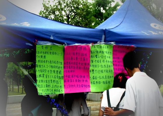 在本次游园会的宣传中,每位同学都提前收到了一张入场券,入场券背后被制作成诸多空格,游戏者参与完一个活动后,空格内便可由工作人员盖一个章,游戏者可凭章数多少进行现场兑奖。丰富的奖品让同学们参与的热情高涨,他们兴致勃勃地从一个游戏玩到另一个游戏,乐此不疲,整个场面和谐融洽,欢声笑语此起彼伏。我院心理部主要负责自由测试区,在该区域中,他们以完全自由地测试身心为原则,制作出一百多道心理测试题,涉及趣味测试、个性设计、爱情、社交、职业规划等诸多方面。每位同学可以任选题目,在卡片上写好答案和题号后到其他区域寻找属于自己的心理测试解析。此游戏极大程度上满足了同学们的猎奇心理,让同学们在游戏中重新认识自我,确定自己的价值定位。而另外一些志愿者的现场激情演唱,则让所有同学群情鼎沸,进入了一个新的高潮。
