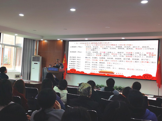 张可荣以《觉醒湖湘动地诗——湖南先进分子的建党事迹和贡献》为题,从中国共产党诞生的历史必然性、近代以来湖南人才辈出的宏大气象、百年前湖南先进分子的创党活动、建党初期湖南创造诸多党史第一这四个部分,向大家讲述了建党之前及建党之初湖湘先进分子行发先声、开先路、当先驱、做先锋的事迹和贡献。