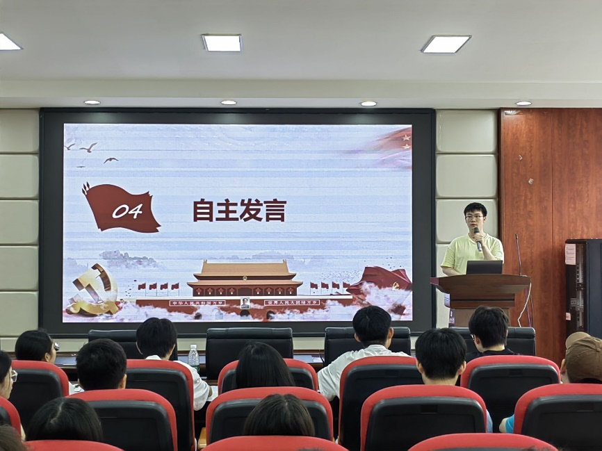 专题汇报环节,学生党员张邵森以“新质生产力”为主题,阐释新质生产力的具体内涵及特点,并从国产新能源汽车崛起之路指出发展新质生产力是推动科学技术创新的重要之路,有助于实现产业创新升级和达到碳达峰,碳中和的目标。并强调培养德才兼备的高素质技术人才是发展新质生产力的重要支撑。