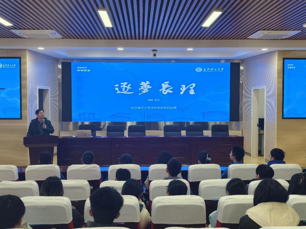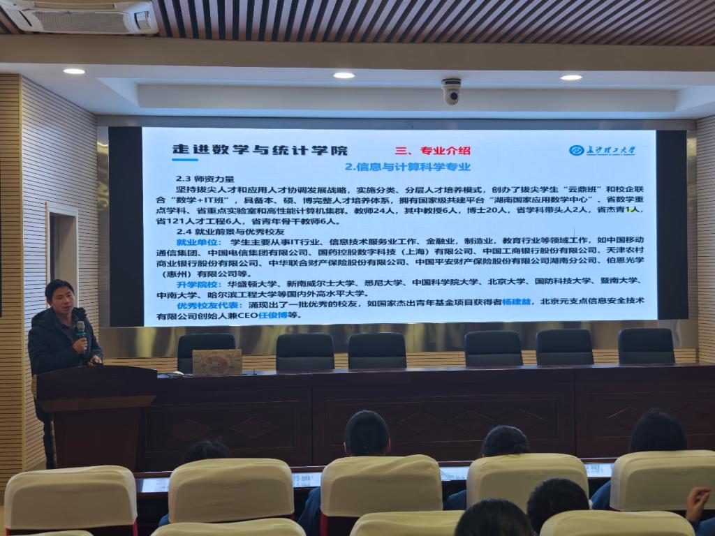 郑忠辉首先对长沙市明德天心中学师生的到来表示最热烈的欢迎。他从特色鲜明的王牌专业、实力强劲的师资力量、丰富优质的学习资源、个性多元的人才培养、交通便利的地理位置、高质量的就业发展、公寓式的住宿环境、丰富多彩的校园文化生活、“无限打卡”的校园美景及网红食堂等十个方面全面展示了太阳成集团tyc122cc入口的办学实力及招生政策等情况。同时,他还对数学与统计学院的发展历程、师资力量、科研实力、育人成效等方面作了介绍,使师生们对太阳成集团tyc122cc入口有了全面的认识,激励同学们报考太阳成集团tyc122cc入口的热情。他还带领师生们参观了学院“工程数学建模与分析”湖南省重点实验室,国家应用数学中心、研究生工作室、实验室机房等,为同学们介绍了数学的应用领域、数学的魅力以及常用的数学软件等,以此激发同学们学习数学的兴趣。