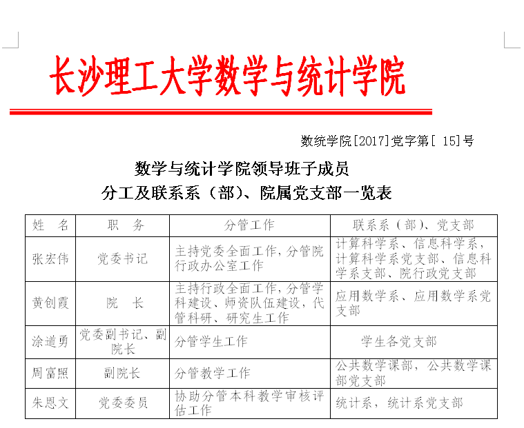 数学与统计学院领导班子成员分工及联系系(部)、院属党支部一览表