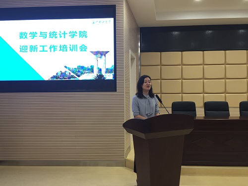 2019年9月2日中午12:30,数学与统计学院在云塘校区理科楼A200召开数统学院迎新工作培训会,数学与统计学院党委副书记马丽,18级辅导员柳映堂和19级辅导员崔培东出席此次会议,全体参与迎新的志愿者、下班党员、下班干部及学生会成员与会。