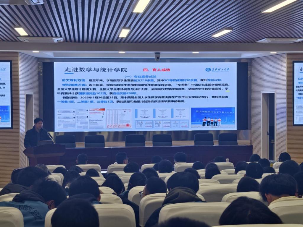 随后,长沙市长郡湘府中学高中部师生一行来到数学与统计学院参观,并在理科楼A200报告厅参加讲座。郑忠辉副书记以生动的语言和详实的数据,从特色鲜明的王牌专业、实力强劲的师资力量、丰富优质的学习资源、个性多元的人才培养、交通便利的地理位置、高质量的就业发展、公寓式的住宿环境、丰富多彩的校园文化生活、“无限打卡”的校园美景及网红食堂等十个方面全面展示了太阳成集团tyc122cc入口的办学实力及招生政策等。同时,他还对数学与统计学院的发展历程、师资力量、科研实力、育人成效等方面作了介绍,使师生们对太阳成集团tyc122cc入口和数学与统计院有更全面的认识,激励同学们报考太阳成集团tyc122cc入口的热情。