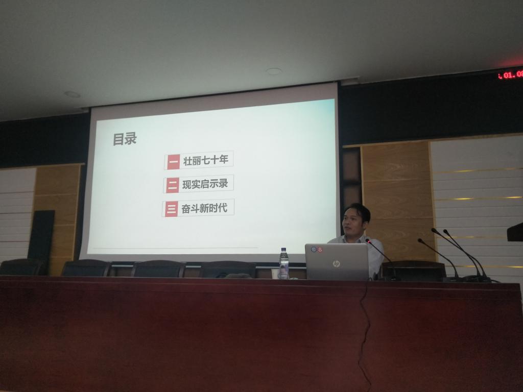 第二次专题党课《新中国成立70周年来的成就及历史经验》,由马克思主义学院副院长梁建新教授主讲。梁教授结合自身的经历、联系新中国成立70周年,声情并茂地为预备党员们介绍了新中国成立70周年来祖国取得的伟大成就,并用生动的事例为同学们讲解“如何学习习近平新时代中国特色社会主义思想”。