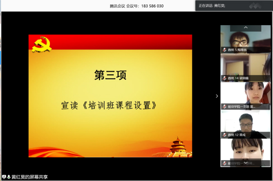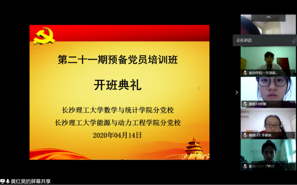 2020年4月14日晚上,数学与统计学院和能源与动力工程学联合举行了第21期预备党员培训班开班典礼,数统学院党建辅导员柳映堂、能动学院党建辅导员代佳欣及两院21期预备党员参