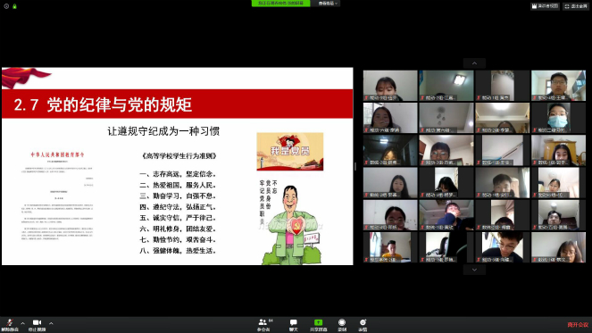 2020年4月21下午,数统学院能动学院联合举办的第11期发展对象培训班在线上先后进行了题为“党的纪律关于新形势下党内政治生活的若干准则的党课,分别由数统学院党委书记张宏伟和经济与管理学院党委副书记兼副院长涂道勇主讲,数统学院党建辅导员柳映堂主持,学院11期全体发展对象参加