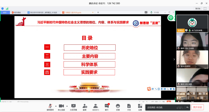 2020年4月22日19时,数统学院与能动学院联合开展第11期发展对象第四次培训课程。本次课程主题为《习近平新时代中国特色社会主义思想的历史地位、核心要义、丰富内涵和实践要求》,由马克思主义学院余乃忠教授主讲。