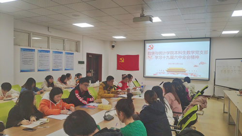 为深入学习贯彻党的十九届六中全会精神,深刻领会过去我们为什么能够成功、未来我们怎样才能继续成功,进一步统一思想、统一意志、统一行动,数统学院本科生数学党支部于12月12日下午13:00开展了以“深入学习贯彻党的十九届六中全会精神”为主题的专题党课,由支部书记柳映堂主讲。