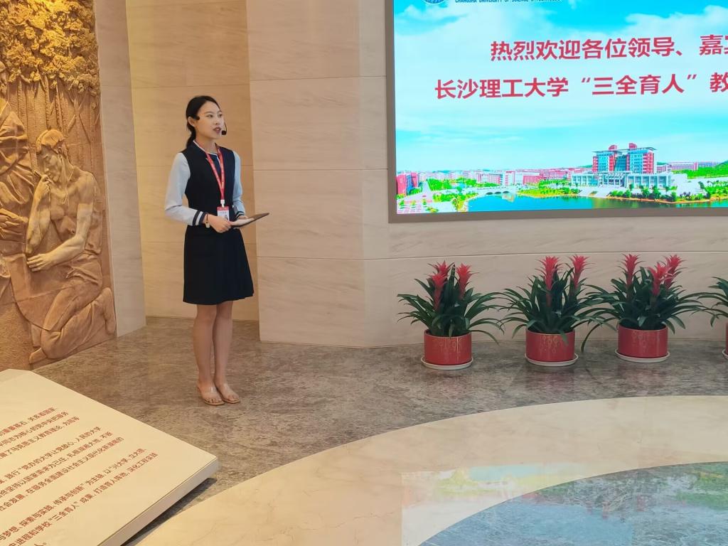 “三全育人”教育基地讲解员在前厅向大家介绍了与学校办学特色紧密相连的元素为背景的浮雕《逐梦》。