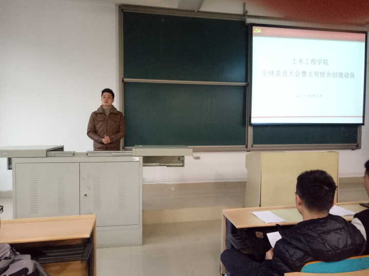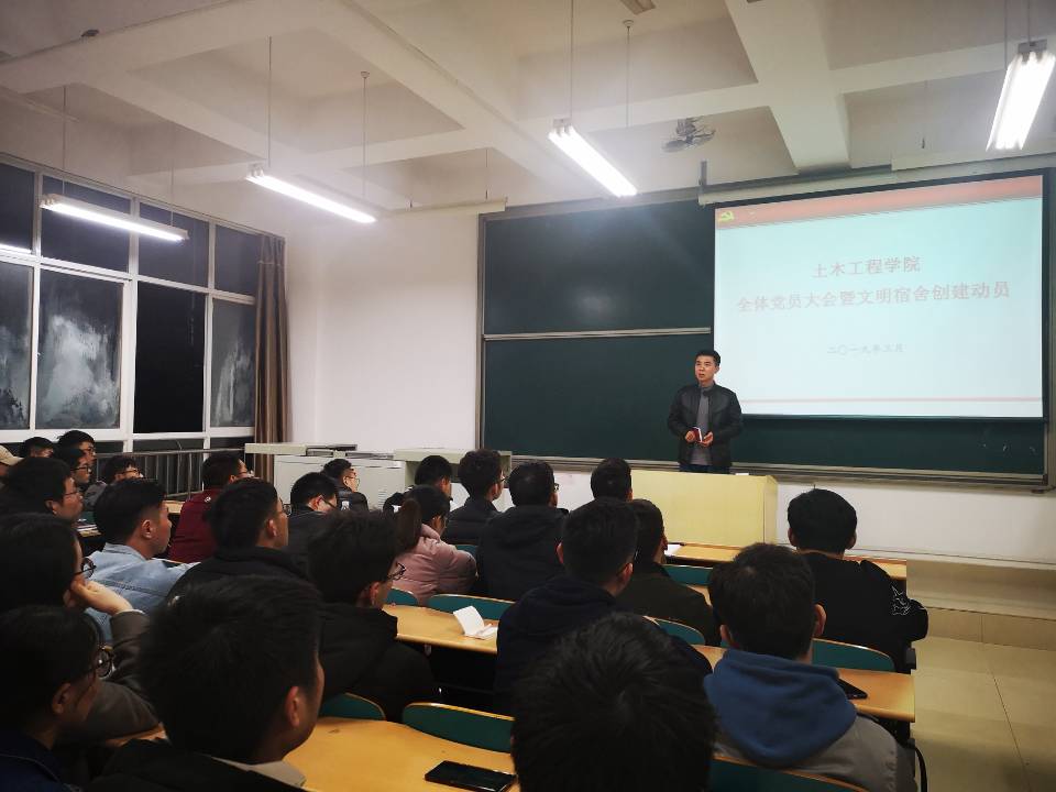 根据我校2019年工作要点,积极开展学生劳动教育,提高学生文明素养,强化学生劳动观念,将学生宿舍打造养成教育的坚实基地。3月11日晚,土木学院在工三A208召开新学期全体学生党员大会暨文明寝室创建动员,学院党委副书记王煜坤、学工办全体辅导员参加。