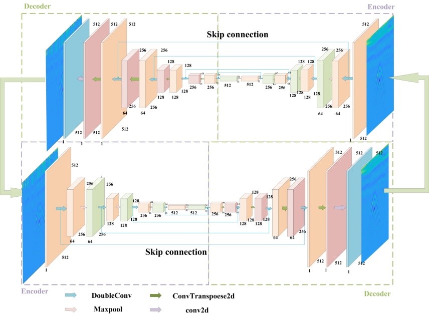 考虑到实际采集中常存在数据缺失与干扰,设计了基于闭环卷积神经网络的插值重建算法(图2),能够在信号衰减、强噪声或局部数据丢失的条件下,重建完整的地下介质响应数据,为后续反演提供可靠基础。