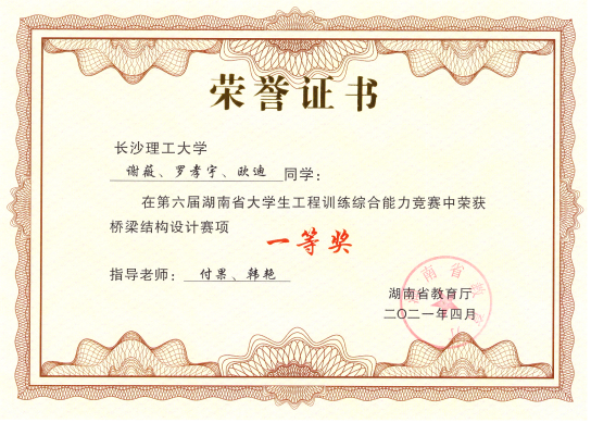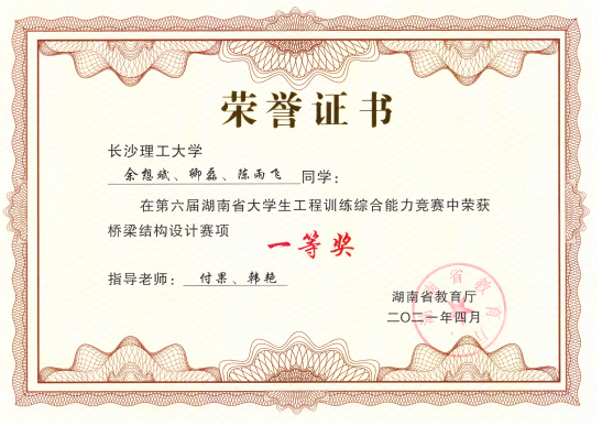 第六届湖南省大学生工程训练综合能力竞赛一等奖2项(桥梁设计项目冠亚军