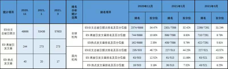我校ESI论文总被引频次排名从2374到2301到2268,百分位数从34.47%到32.42%到31.24%,都在持续进步。