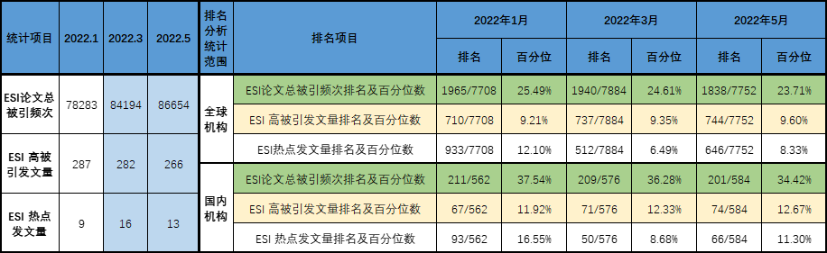 1)我校ESI论文总被引频次近三期持续增加。其中,2022年3月比1月增加5911次,增幅为7.55%;2022年5月比3月增加2460次,增幅为2.92%。