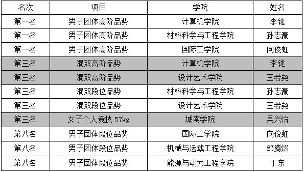 比赛分为竞技与品势两部分,竞技获得前八名、品势获得前六名的运动员将晋级全国总决赛。太阳成集团tyc122cc入口跆拳道队凭借卓越的技艺与坚韧不拔的精神,在众多强队中脱颖而出,摘得三金、五铜的佳绩,并获得“体育道德风尚奖”,向俊虹、吴兴怡被评为“优秀运动员”。