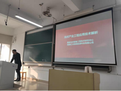 讲座一开始,张副总向大家介绍了自己学习、工作的经历,给学生讲解了在炭达峰、碳中和背景下红太阳新能源公司的现状与发展,红太阳新能源公司成立于2008年,隶属于中国电子科技集团有限公司,是中电科电子装备集团有限公司的全资子公司。公司集硅材料,高效单晶电池,光伏组件、光伏系统集成应用于一体,是先进的光伏全产业链制造商,产值规模位列长沙市工业前十强。张副总还对光伏产业发展背景、光伏发电原理和产业链、光伏电池产品工艺及其数字化智能制造生产线、数字化信息系统进行了具体的介绍。最后,张副总介绍了中国-埃及可再生能源国家联合实验室、印度光伏生产线、土耳其500MW光伏产业园等公司“一带一路”对外合作项目的进展。
