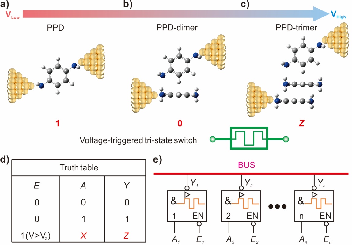 基于PPD分子在电场作用下表现出的可控二聚与三聚行为,该研究工作提出了一个由外加电场驱动的超分子电路三态开关的概念模型 (图3a-c)。其中,高电导态 (GH,PPD单体) 对应逻辑高电平“1”,中电导态 (GM,PPD二聚体) 表示逻辑低电平“0”,而低电导态 (GL,PPD三聚体) 则作为高阻抗状态“Z”输出。超分子电路中的三态开关可应用于可编程总线架构中,如图3d, e所示,EN信号 (E) 作为偏压 (V) 的全局控制方案:当EN=1(启用)时,会施加一个有效的偏压窗口 (V<V1或V1<V<V2),以驱动三态开关进入开/关状态(逻辑“1”或“0”)。当EN=0(禁用)时,偏压超过V2 (V>V2),使三态开关切换到高阻抗状态(Z)。只有当EN 信号处于激活状态时,逻辑电平才会输出。通过外部电场精确控制PPD分子的堆叠状态,可以在需要时选择性地激活或抑制总线上的单个单元。这种动态调节使总线能够在不同时间间隔内承载不同的信息流,从而实现多任务并行处理或复杂的逻辑运算,有助于提高下一代分子级信息处理的并行性和降低能耗。