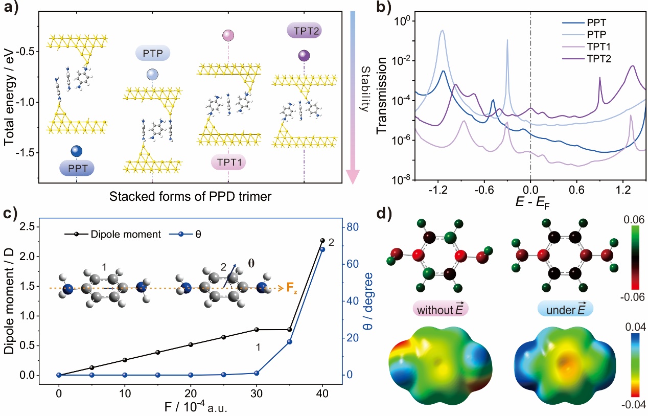 为了进一步揭示电场诱导三态开关的微观机制,本研究工作结合密度泛函理论 (DFT) 与非平衡格林函数 (NEGF) 方法,系统计算了不同π-π堆叠构型下的电子输运特性与体系稳定性。结果表明,PPD三聚体中的PPT构型(平行-平行-垂直的π-π堆叠形式)在能量上最稳定,且其传输特性与实验观测PPD分子的低导态 (GL) 高度吻合 (图2a, b)。偶极矩计算表明,随着外加电场强度的增加,PPD分子偶极矩不断变大且其方向逐渐偏离预设电场方向 (图2c),其偶极矩方向源于苯环的π电子系统与─NH2基团的极性共同作用。如图2d上图所示,外电场的施加显著改变了PPD分子的Mulliken电荷分布。特别地,─NH2锚定基团的取向发生明显重排,同时苯环上C原子电荷重新分布,从而使分子偶极方向偏离外加电场方向。此外,外加电场还显著影响了PPD分子的静电势 (ESP)。如图2d下图所示,在无电场时,ESP呈对称分布;而在施加电场后,分子正负电荷区域之间的势梯度明显增强,进一步强化了分子间的静电吸引。