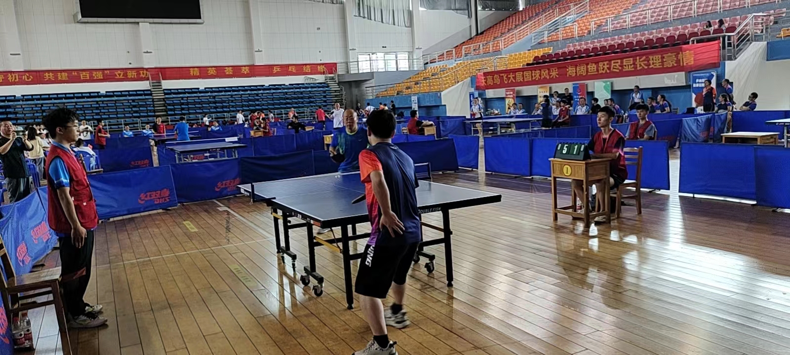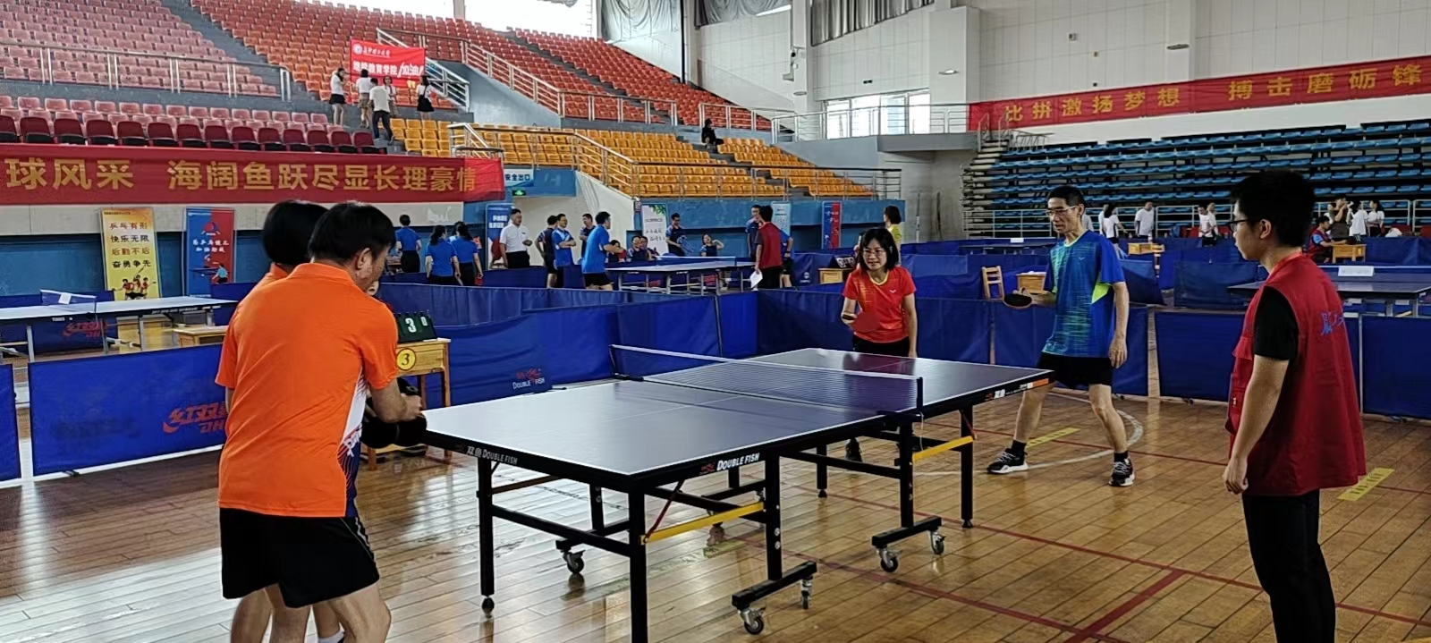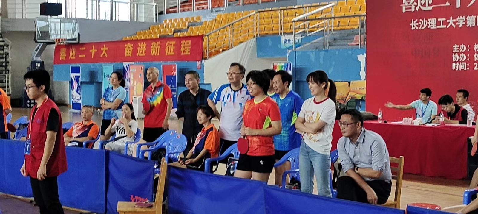 学院对此次乒乓球比赛高度重视,比赛期间,党委书记张国强、副院长张卫兵亲临比赛现场为运动员加油助威,张国强书记担任球队领队,党委副书记宋国宁、副院长兼分工会主席刘斯作为运动员亲自上场比赛。即将退休的厉江帆、袁剑辉两位教授也被邀请加入球队,在比赛中敢打敢拼,为学院荣誉而战,给年轻人树立了榜样。在主力队员刘新海、杨昌虎、廖家欣等几位老师的带领下,年轻队员们也都打出了气势,比赛场面精彩纷呈,打出了物电学院的精气神、打出了物电人的精神风貌。