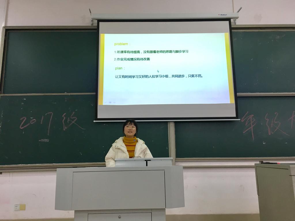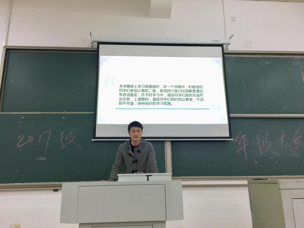 首先,17级各班班长对本学期班级的学习以及活动进展做了详细的报告,比如电信3班的班长谭馨,把本学期班级的四六级过级率,二级计算机通过率数据进行了收集,以便更好地了解同学们的学习情况。而光电2班的班长则和各班委一起,对本学期的各个方面的活动进行了总结,对同学们学习以外的生活有一个大致的了解,在一定程度上增强了班级的凝聚力。之后,辅导员赵俊程上台,千叮咛万嘱咐同学们寒假安全注意事项:检查电闸、水闸关闭;防风、防火、防盗;严禁外宿、谨防传销与校园贷;食品安全与放假外出游玩安全事宜,并对之后的放假安排做了详尽的规划,布置了目标规划的寒假作业。