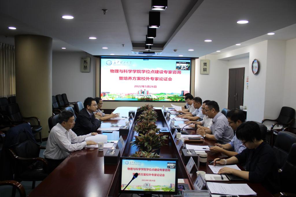 2022年5月26日下午,物电学院学位点建设专家咨询暨培养方案校外专家论证会在一办六会议室召开,会议采取线上线下相结合的方式进行。中南大学副校长何军教授、湖南师范大学原副校长匡乐满教授、湘潭大学钟建新教授出席现场会议,大连理工大学物理学院院长赵纪军教授在线上参加会议。我校党委委员、副校长刘朝晖教授、研究生院副院长龙科军教授,物电学院学位点负责人肖伏良教授、唐立军教授和学院党委书记张国强、副院长张卫兵、范志强、刘斯等出席会议。会议由物电学院党委书记张国强主持。