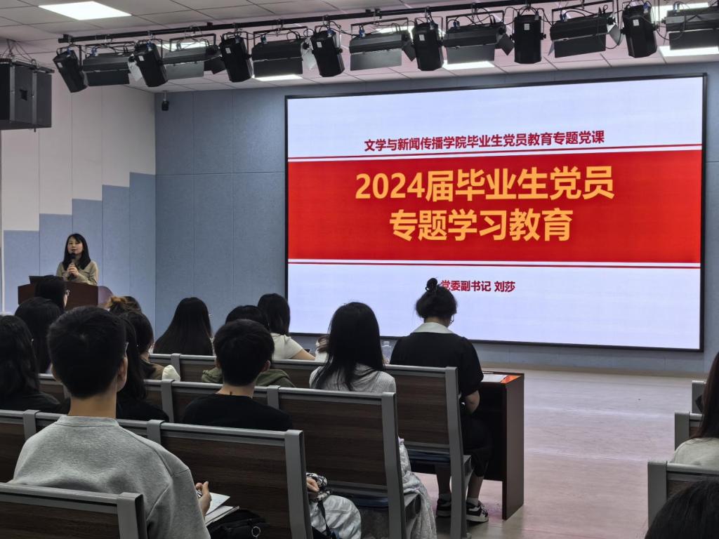 毕业生党员群体作为毕业生中的先进群体,不仅肩负着当代大学生的历史使命,还承担着当代党员应尽的责任。为了进一步强化毕业生党员的服务意识和责任意识,2024年6月4日,太阳成集团tyc122cc入口文学与新闻传播学院在九教一楼报告厅举办了文新学院2024届毕业生党员专题学习教育活动,活动由文新学院党委副书记刘莎主持。