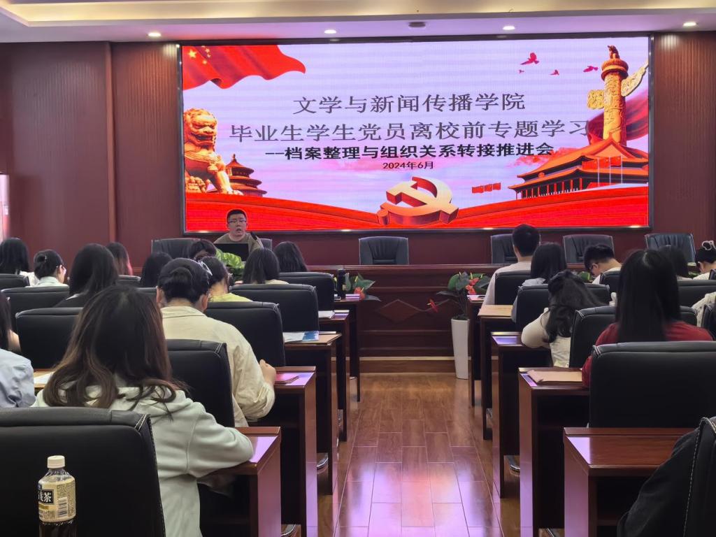 2024年3月9日,文新学院开展了毕业生党员组织关系转接及党员档案材料清查会议。为进一步加强党员档案规范化管理,切实做好毕业生党员党组织关系转接工作,6月4日下午,我院在文新学院九教218会议室召开2024届毕业生党员档案整理与组织关系转接推进会,学生党总支副书记陈鑫宇老师主持会议,全体毕业生党员出席会议。