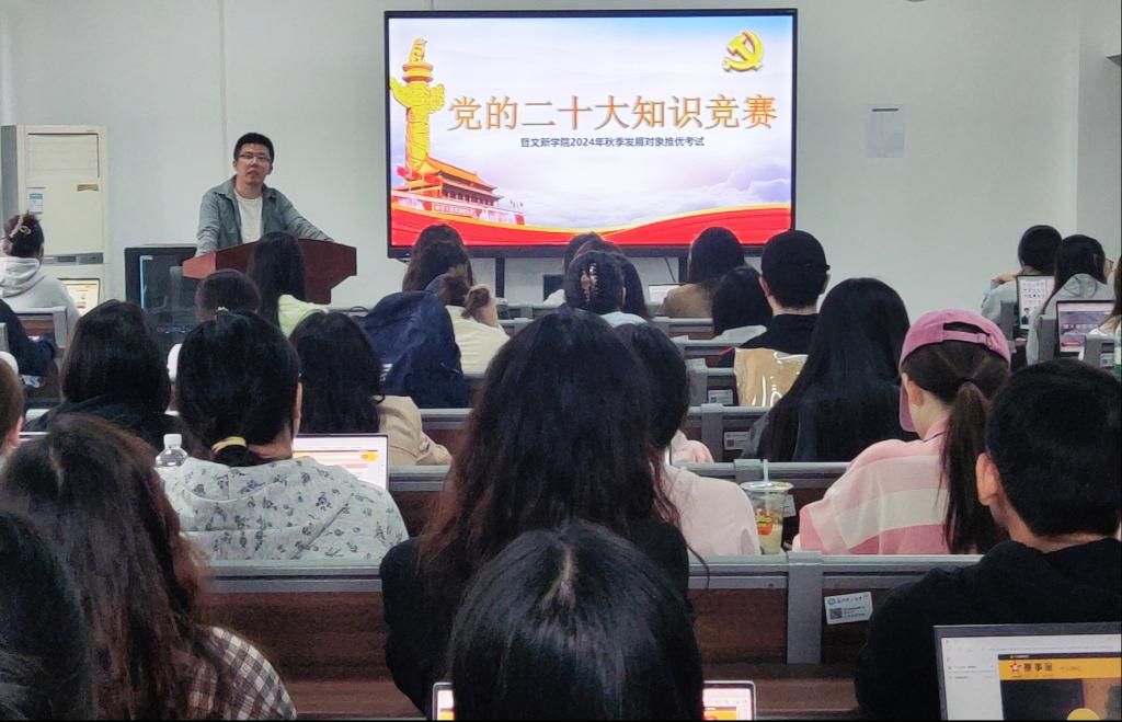 为贯彻落实党的二十大精神,积极探索“党建+互联网”新模式,进一步提升积极分子的理论知识水平,10月16日12时30分,“党的二十大知识竞赛暨文新学院2024年秋季发展对象推优考试”于我校金盆岭校区九号教学楼417室成功举行。