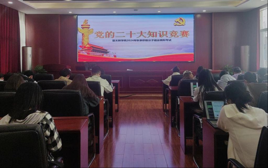 为贯彻落实党的二十大精神,积极探索“党建+互联网”新模式,进一步提升积极分子的理论知识水平,11月12日12时10分,“党的二十大知识竞赛暨文新学院2024年秋季积极分子第一次模拟考试”于我校金盆岭校区九号教学楼218室成功举行。