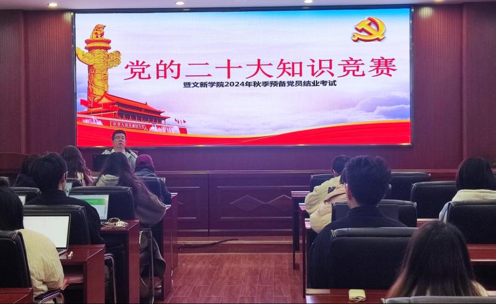 为贯彻落实党的二十大精神,积极探索“党建+互联网”新模式,进一步提升预备党员的理论知识水平,11月20日12时15分,“党的二十大知识竞赛暨文新学院2024年秋季预备党员结业考试”于我校金盆岭校区九号教学楼218室成功举行。